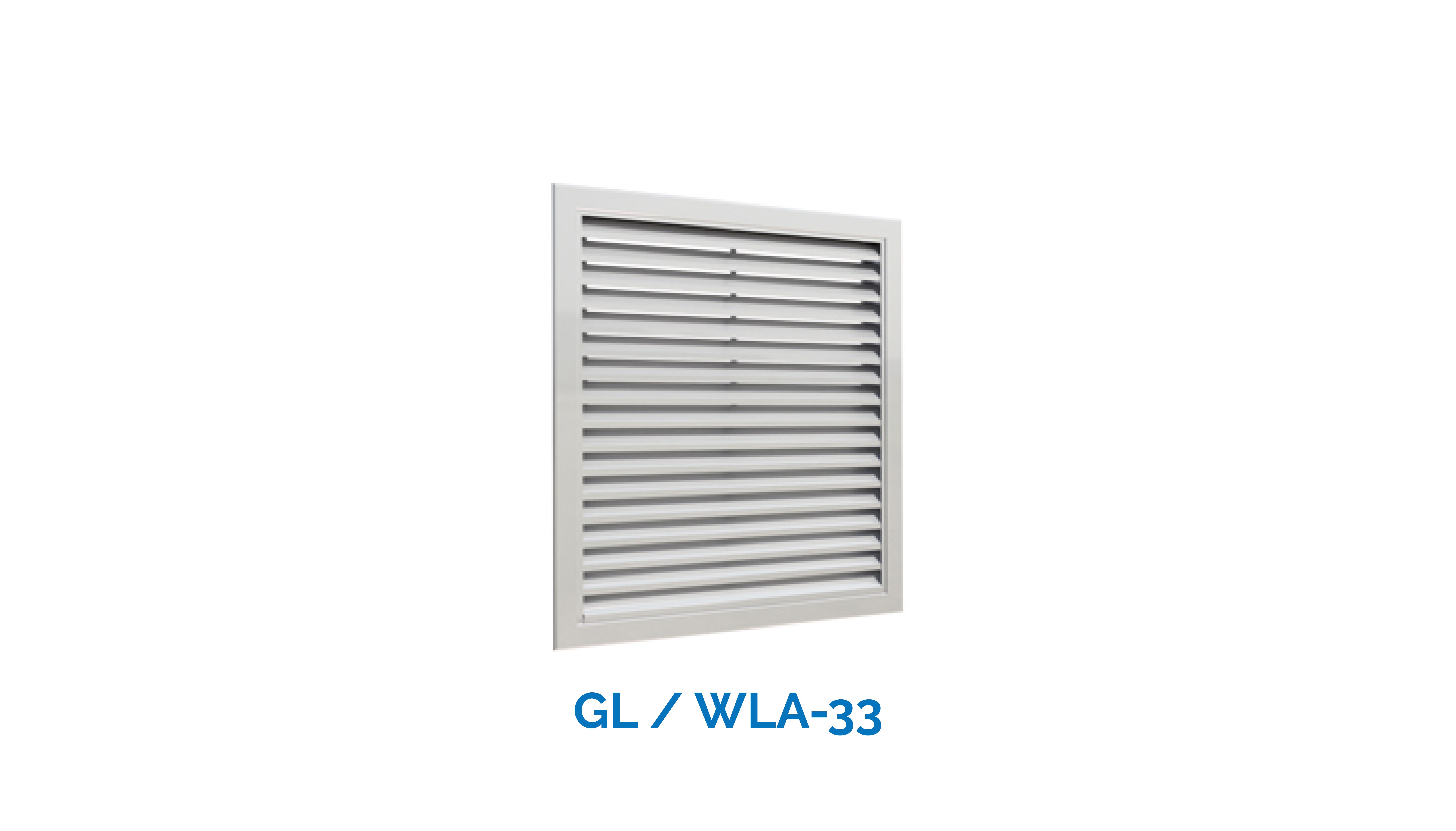 La serie GL è rappresentata da una gamma di griglie di aspirazione ed espulsione ad elementi orizzontali fissi inclinati a 49° utilizzate per l'immissione di aria esterna, per l'emissione dell'aria esausta dagli ambienti. Si raccomanda nel posizionamento esterno di queste unità terminali l'applicazione di una rete protettiva antivolatile.