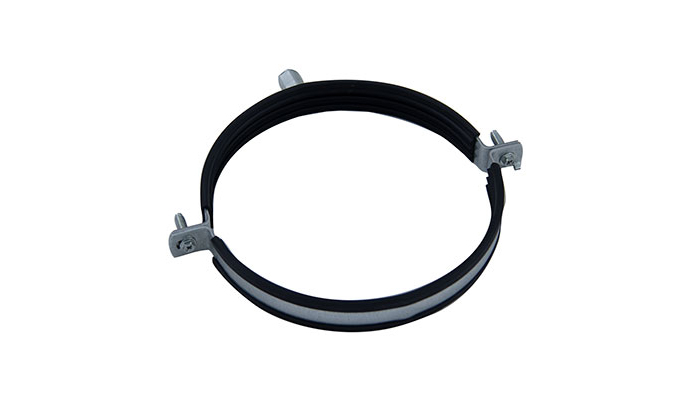 Collare di staffaggio per canali circolari fornito di profilo in gomma antivibrante, con ancoraggio centrale M8/M10. Versione con sgancio rapido per diametri Ø 63–400. Dado M10 per diametri Ø 450–1250. Per canali isolati è consigliato installare il collare all’interno dell’isolamento.