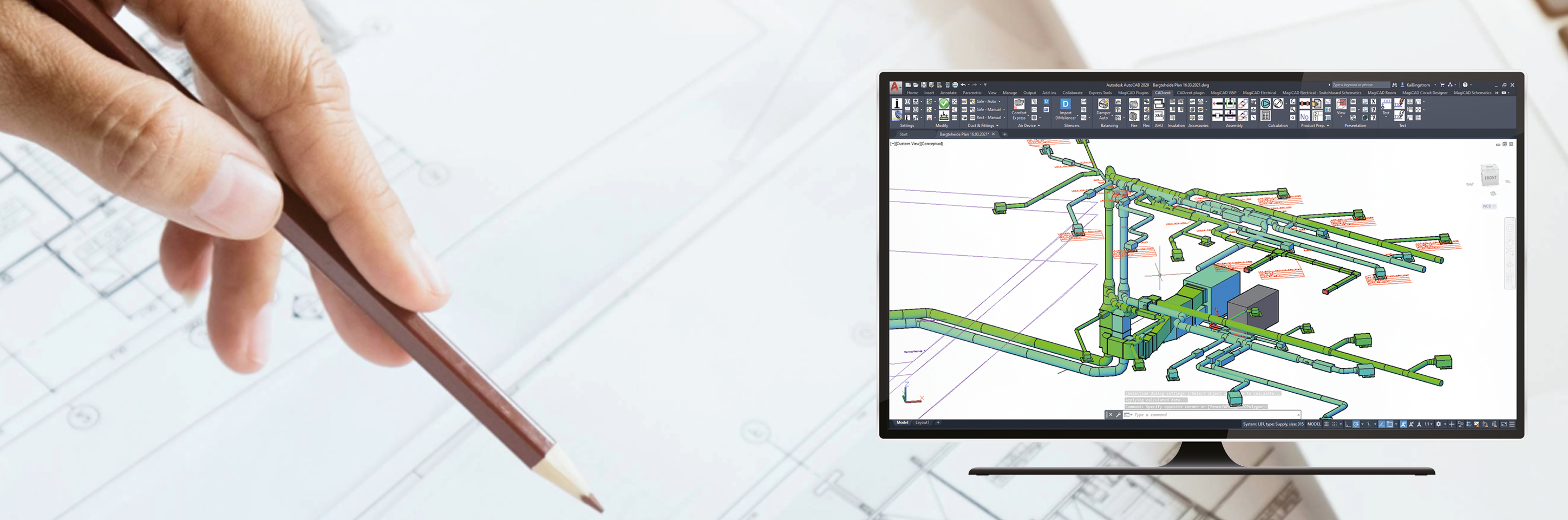 CADvent è un software che consente la progettazione e il disegno 2D/3D di impianti aeraulici, contenendo non solo le semplici informazioni geometriche degli elementi, ma anche tutti i dati tecnici necessari per la realizzazione dell’impianto, a partire dal suo dimensionamento fino alla produzione di liste materiali per facilitare la stesura di capitolati.